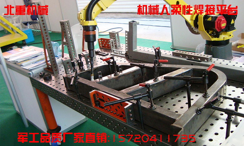 3D焊接工作臺非常堅固,可承受非常高的載重量。它的五個面均加工有規(guī)則的孔,并刻有網(wǎng)線。(孔沒有斜度和T型槽)。在3D焊接工作臺上,任何工件都可以用定位夾緊銷(PC銷/鎖緊銷)進行各種各樣的定位和夾緊。此PC銷已獲得專利權(quán)。幾個3D工作臺可以在任何五個面上直接連接在一起。這個模塊化系統(tǒng)在安裝、調(diào)整和夾緊工件中完美的體現(xiàn)了它通用的功能。它的優(yōu)點尤其在于實現(xiàn)了大型工件的應(yīng)用上。因為有上述功能整套裝備可根據(jù)產(chǎn)品的變化而變化,一套夾具就可完成幾個產(chǎn)品或幾十個產(chǎn)品的需求,從而大大的加快了產(chǎn)品的研發(fā)、試制的進程,節(jié)省大量的人力、物力和財力(環(huán)保和低碳產(chǎn)品)。
